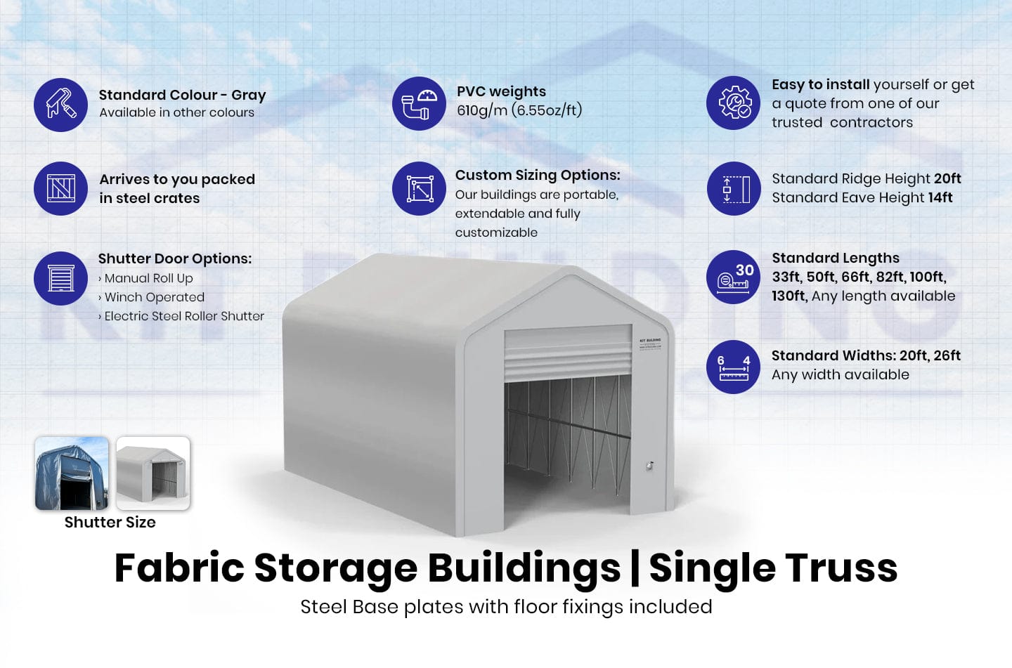 - Stoffmaterialien: Wir bieten eine 5-jährige Produktgarantie auf unsere PVC 23 oz/sy (610g/m²) Außenbaumaterialien, die Sie gegen Materialfehler absichert. Kit Buildings